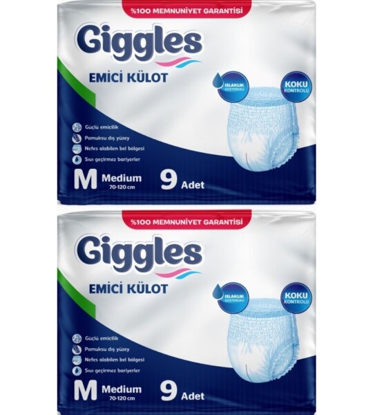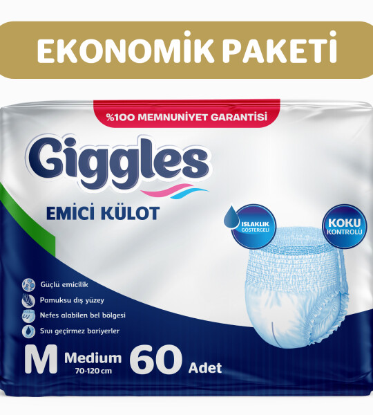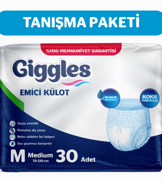 Giggles Yetişkin Emici Külot, istemsiz sıvı kaçırma sorunlarıyla başa çıkmanın en pratik ve güvenilir yoludur. Sıradan iç çamaşırları sıkıntılı anlarınızda size yeterli koruma sağlamazken, Giggles ile her anınızı rahat ve özgür geçirebilirsiniz.